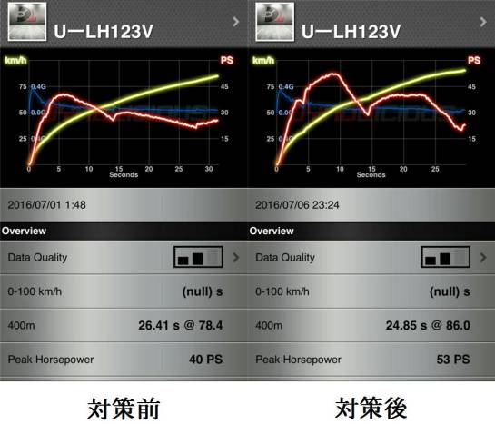 弊社のディーゼル規制解除の対策におけるパワーの変化を比較してみました。